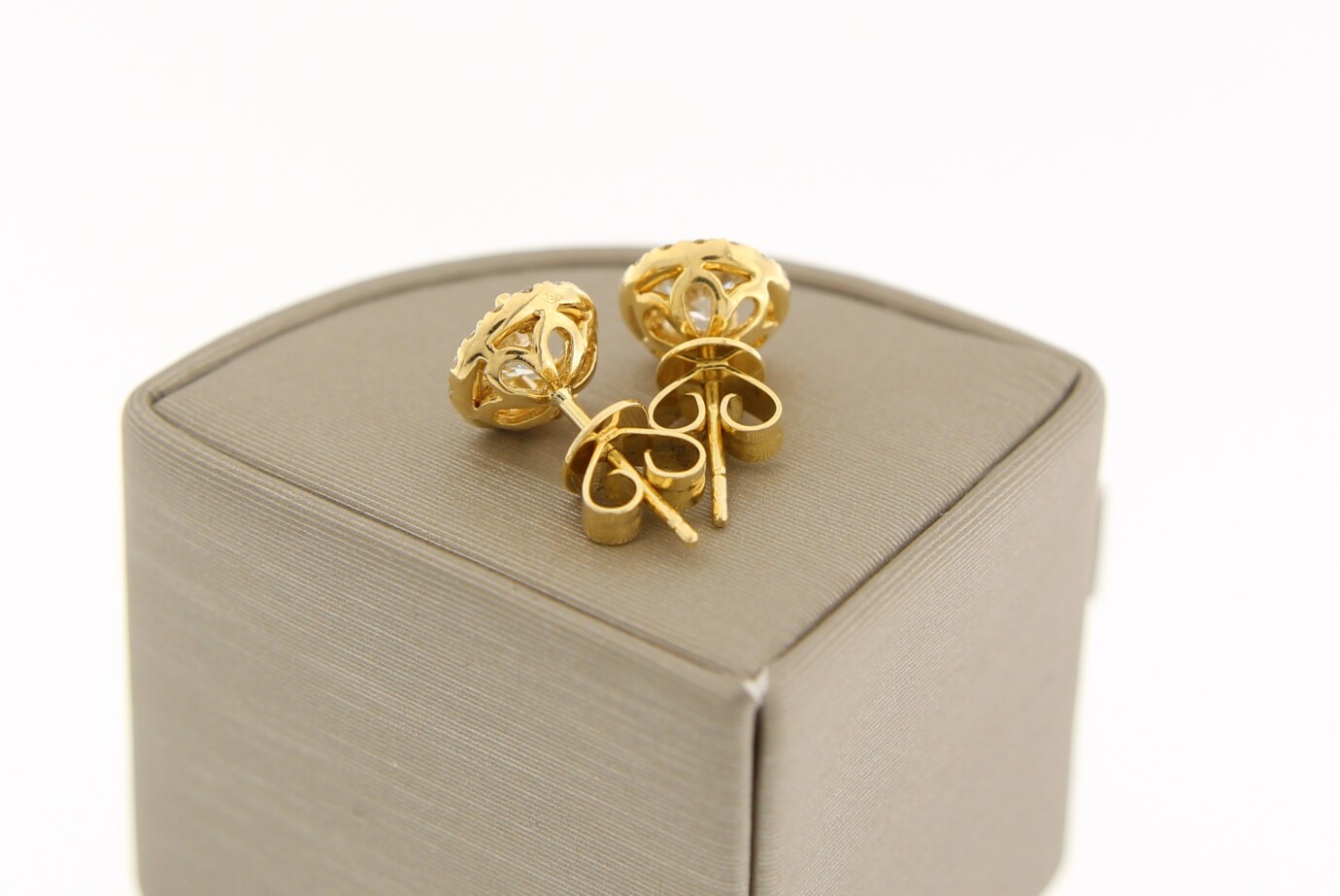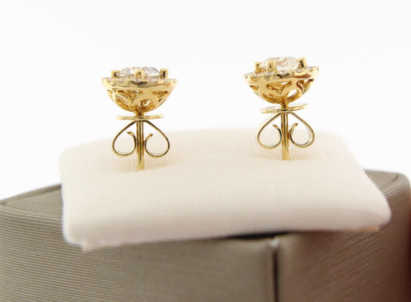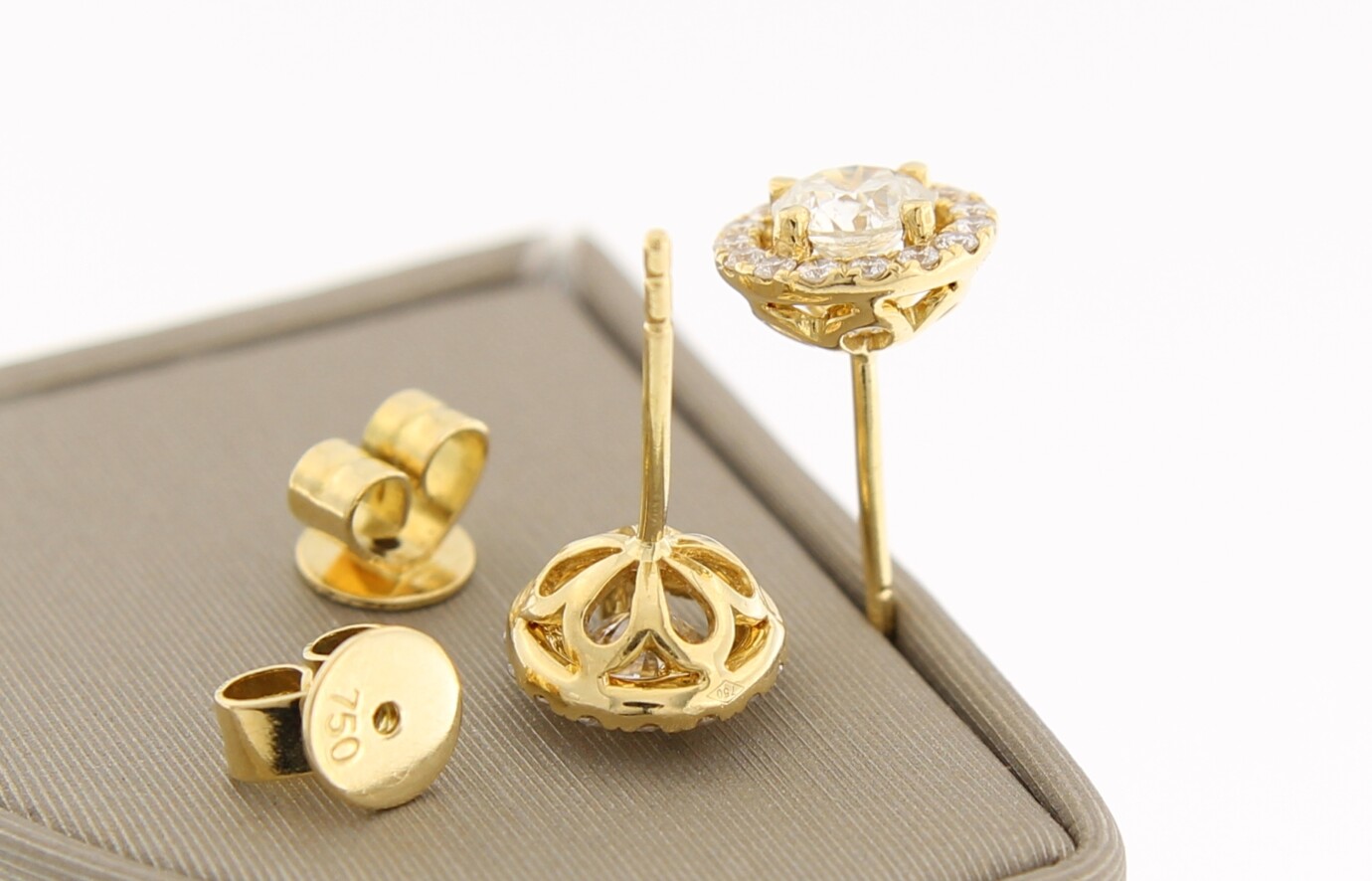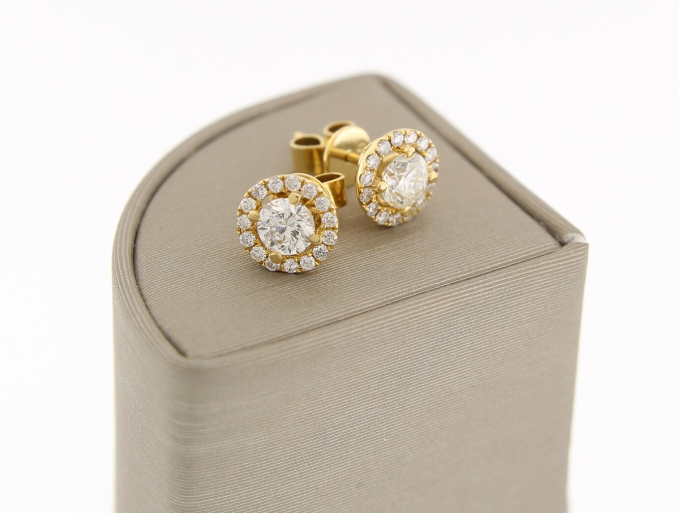 18 k geel gouden solitair oorknoppen, met 2 x 0.40 ct en 30 x 0.01 ct P1/SI