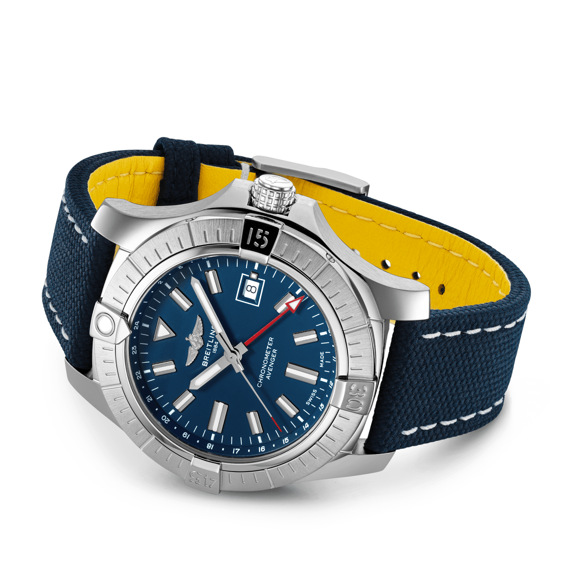 De Breitling Avenger Automatic GMT 45 A32395101C1X2 is vet, extreem robuust en schokbestendig en heeft een extra rode wijzer die een tweede tijdzone aangeeft. Als een echte Breitling Avenger kan hij worden gebruikt met handschoenen aan en biedt hij ongeëvenaarde veiligheid en betrouwbaarheid aan elke avonturier in de lucht. De Avenger Automatic GMT 45 heeft een stevige roestvrijstalen kast van 45 mm, een blauwe wijzerplaat en een keuze uit een roestvrijstalen armband, of een blauwe militaire leren band die past op een roestvrijstalen gesp of vouwsluiting. Dankzij de robuuste bezel en het speciale grippatroon op de kroon kan de Avenger Automatic GMT 45 gemakkelijk met handschoenen worden bediend. Breitling Instruments for Professionals!