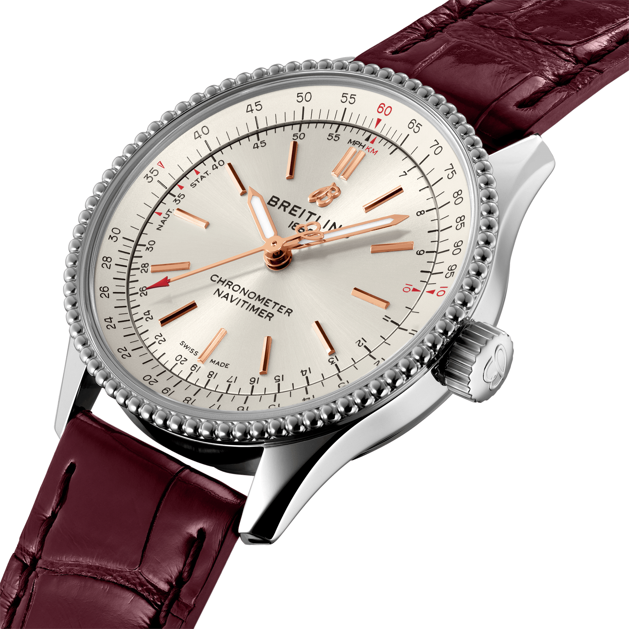 De Breitling Navitimer Automatic 35 A17395F41G1P2 is verfijnd en elegant, de Navitimer Automatic 35 combineert de historische aantrekkingskracht van een waar icoon met de verfijning van een eigentijds uurwerk. Verkrijgbaar in een verscheidenheid aan materialen, waaronder roestvrij staal en 18k roodgoud, de 35 mm kast heeft een bezel met parelrand en een reeks elegante zilveren, blauwe, koperen of diamanten wijzerplaten van wit parelmoer. De Navitimer Automatic 35 wordt aangeboden met een bijpassende stalen band of een glanzende blauwe, bruine of bordeauxrode alligatorband die zowel op een roestvrijstalen gespsluiting als op een vouwsluiting past en wordt aangedreven door de Breitling Calibre 17, een COSC-gecertificeerde chronometer. Breitling Instruments for Professionals!