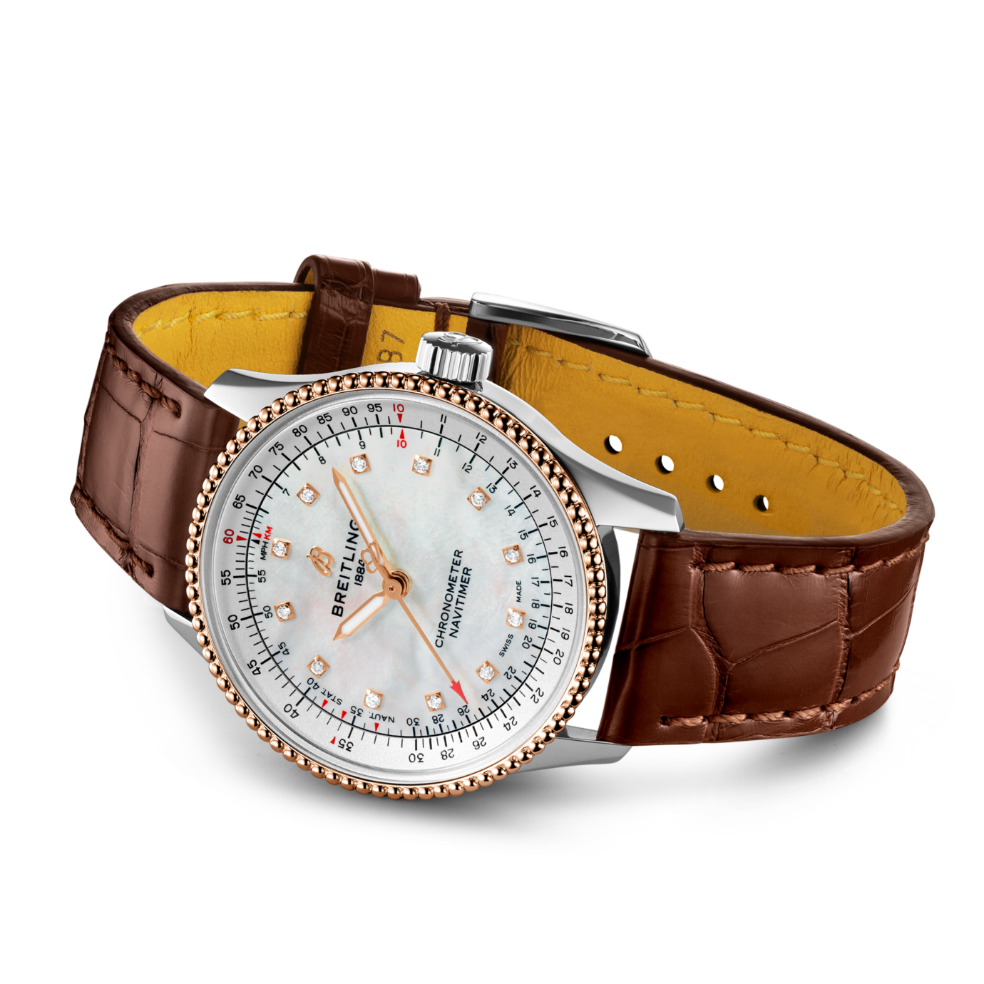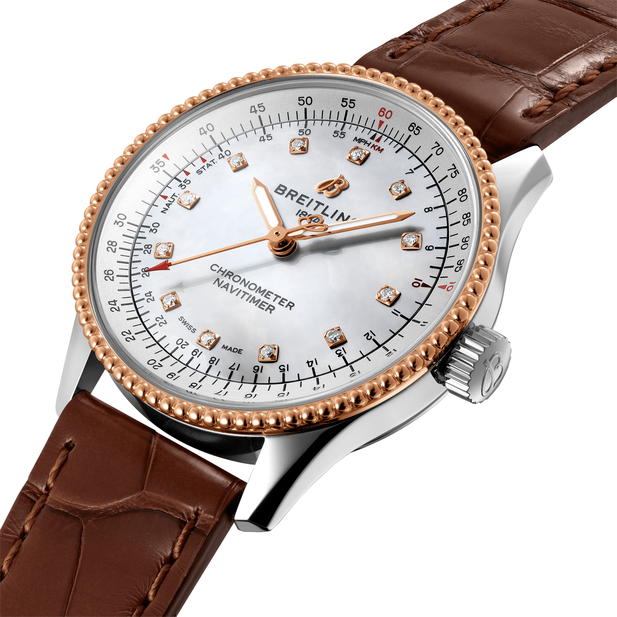 De Breitling Navitimer Automatic 35 U17395211A1P1 is verfijnd en elegant, de Navitimer Automatic 35 combineert de historische aantrekkingskracht van een waar icoon met de verfijning van een eigentijds uurwerk. Verkrijgbaar in een verscheidenheid aan materialen, waaronder roestvrij staal en 18k roodgoud, de 35 mm kast heeft een bezel met parelrand en een reeks elegante zilveren, blauwe, koperen of diamanten wijzerplaten van wit parelmoer. De Navitimer Automatic 35 wordt aangeboden met een bijpassende stalen band of een glanzende blauwe, bruine of bordeauxrode alligatorband die zowel op een roestvrijstalen gespsluiting als op een vouwsluiting past en wordt aangedreven door de Breitling Calibre 17, een COSC-gecertificeerde chronometer. Breitling Instruments for Professionals!