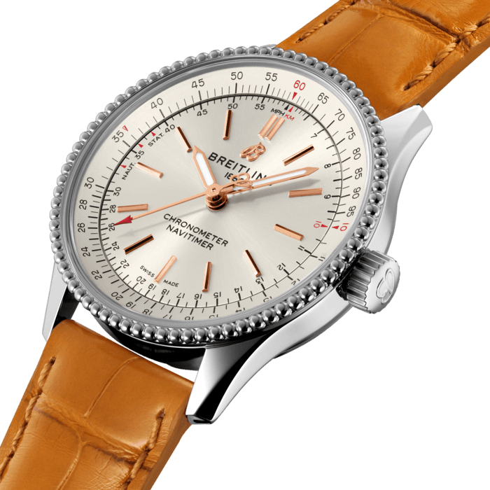 Breitling Navitimer Automatic 35 A17395F41G1P4 verfijnd en elegant, de Navitimer Automatic 35 combineert de historische aantrekkingskracht van een echt icoon met de verfijning van een eigentijds uurwerk. Verkrijgbaar in een verscheidenheid aan materialen, waaronder roestvrij staal en 18k rood goud, de 35 mm kast heeft een bezel met kralen en een reeks elegante zilveren, blauwe, koperen of met diamanten bezette witte parelmoeren wijzerplaten. De Navitimer Automatic 35 wordt aangeboden met een bijpassende stalenband of een glanzende blauwe, bruine of bordeauxrode alligatorband die zowel op een gespsluiting als op een vouwsluiting past, en wordt aangedreven door de Breitling Calibre 17, een COSC-gecertificeerde chronometer. De Breitling Navitimer Automatic 35 A17395F41G1P4 is ook leverbaar met een ROZE krokoband.