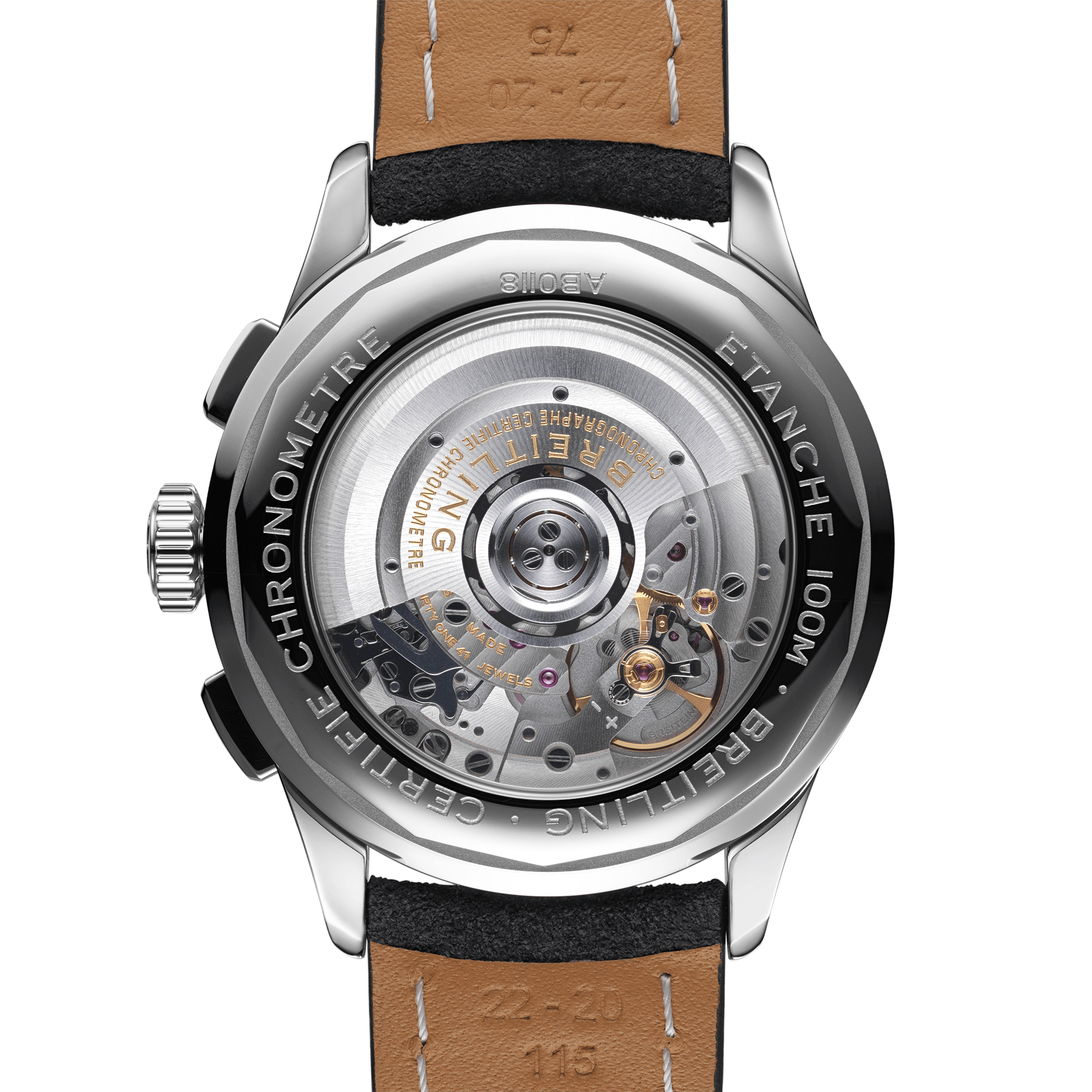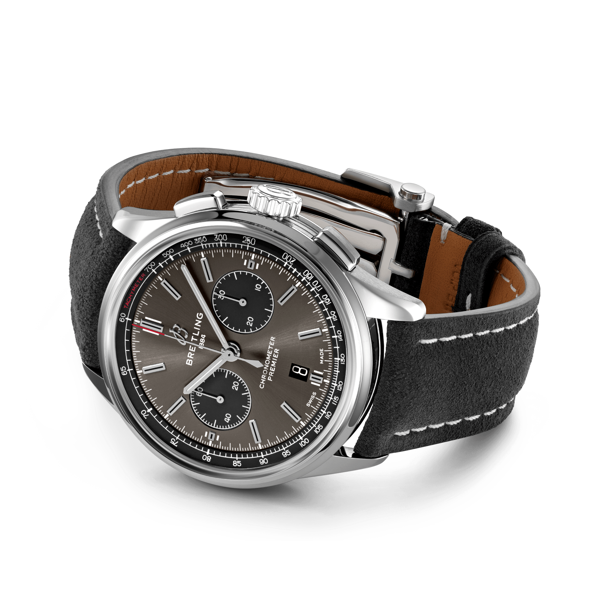 De Breitling Premier B01 Chronograph 42 AB0118221B1X1 is ontworpen door Willy Breitling in de jaren 40, was de Premier het allereerste horloge van het merk dat gewijd was aan stijl. Met elegante details en modern-retro accenten, voldoet deze herinterpretatie van de Premier aan de reputatie van zijn voorvader: het is “een horloge met een onberispelijke smaak”. Met rechthoekige chronograaf pushers, evenals een bi-compax chronograaf panda-look, toont de Premier een verscheidenheid aan elegante ontwerpdetails, zoals de groeven aan de zijkant van de kast of de open saffieren achterkant van de kast. Verkrijgbaar in een verscheidenheid aan materialen, waaronder roestvrij staal of 18 k rood goud, de Premier B01 Chronograph 42 heeft een reeks zwarte, antraciet, zilveren of blauwe wijzerplaten. Deze Premier wordt aangeboden met een bijpassende stalen band, of een band van krokodillenleer of nubuck kalfsleer die zowel aan een gesp als een vouwsluiting past, en wordt aangedreven door de in-house Breitling Manufacture Calibre 01, een COSC-gecertificeerde chronometer. Breitling Instruments for Professionals!