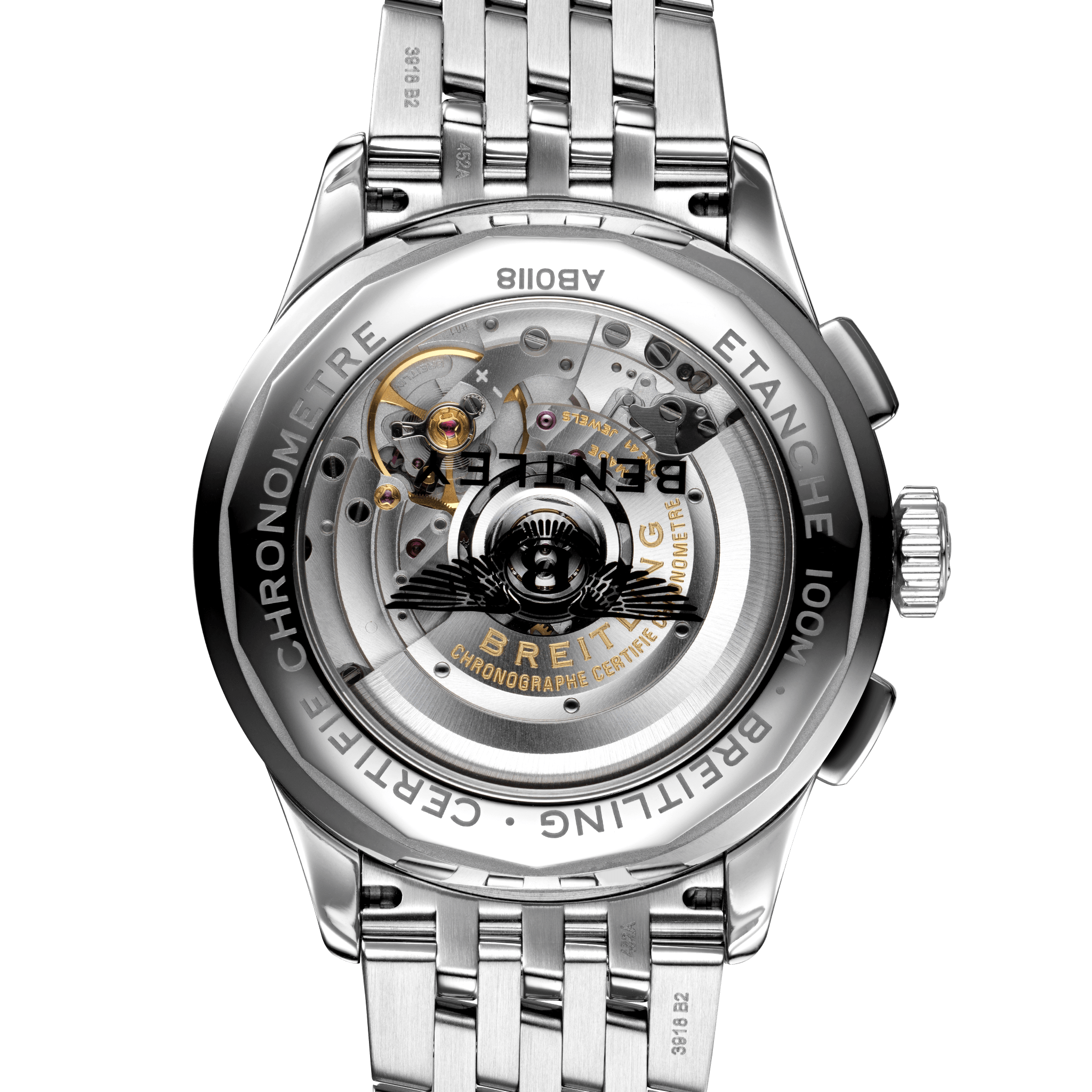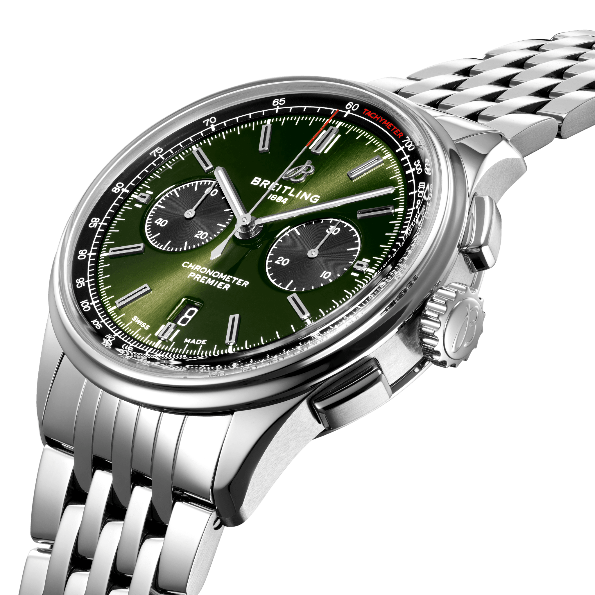 De Breitling Premier B01 Chronograph 42 Bentley British Racing Green AB0118A11L1A1 deze elegante Premier-chronograaf viert het partnerschap van Breitling met Bentley, de eerste naam in luxe autorijden. Het heeft een roestvrijstalen kast van 42 mm, gepresenteerd op een klassieke roestvrijstalen armband met zeven rijen. De opvallende Britse racegroene wijzerplaat wordt geaccentueerd door contrasterende zwarte chronograaftellers van 30 minuten en 12 uur. Een transparante saffieren achterkant onthult het zelfopwindende, high-performance chronometer-gecertificeerde chronograafkaliber, Breitling Manufacture Calibre 01, dat wordt geleverd met een garantie van vijf jaar. Naast de versie met de roestvrijstalen armband is dit model ook verkrijgbaar met een groene nubuckleren band die past bij de wijzerplaat. Twee van ’s werelds elegante, hoogwaardige merken om je pols. Breitling Instruments for Professionals! De Breitling Premier B01 Chronograph 42 Bentley British Racing Green AB0118A11L1A1 is ook leverbaar met GROENE KALFSBAND.