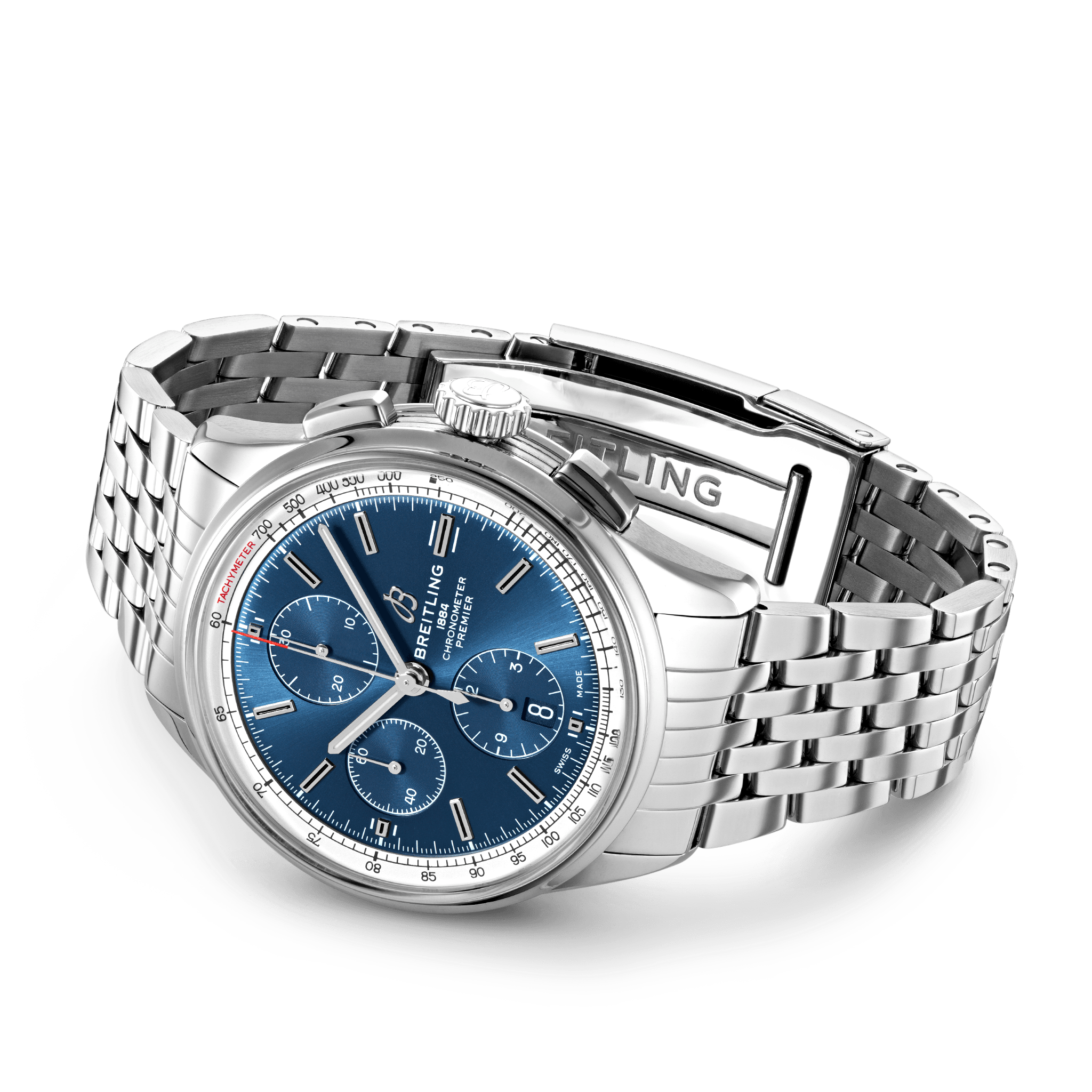 De Breitling Premier Chronograph 42 A13315351C1A1 is ontworpen door Willy Breitling in de jaren 40, was de Premier het allereerste horloge van het merk dat gewijd was aan stijl. Met elegante details en modern-retro accenten, voldoet deze herinterpretatie van de Premier aan de reputatie van zijn voorouders: het is “een horloge met een onberispelijke smaak”. De Premier toont een verscheidenheid aan elegante ontwerpdetails, zoals de groeven aan de zijkant van de kast of de rechthoekige chronograafdrukkers. De Premier Chronograph 42 is verkrijgbaar in roestvrij staal en heeft een zwarte of blauwe wijzerplaat. Deze Premier wordt aangeboden met een bijpassende stalen band of een keuze uit een band van krokodillenleer of nubuck kalfsleer die past bij zowel een gespsluiting als een vouwsluiting en wordt aangedreven door de Breitling Calibre 13, een COSC-gecertificeerde chronometer. Breitling Instruments for Professionals!