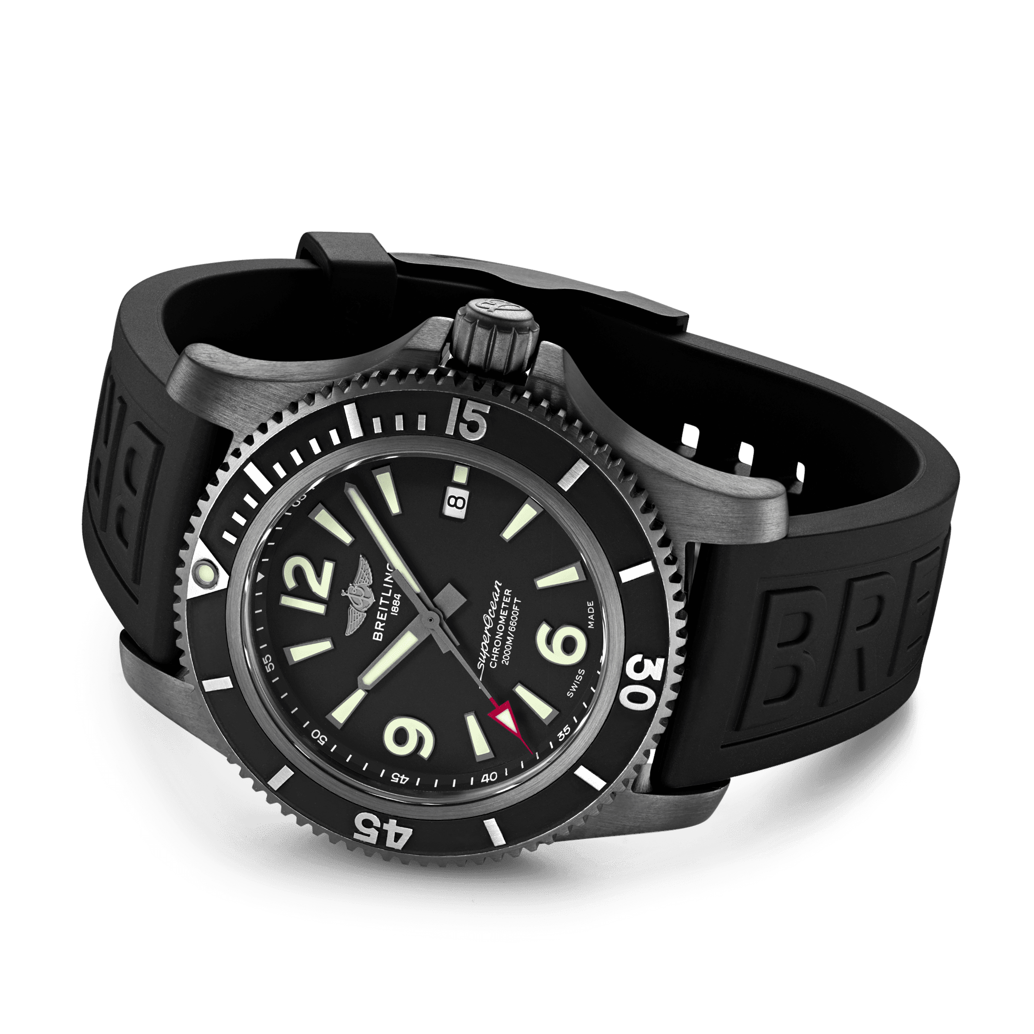 De Breitling Superocean Automatic 46 Black Steel M17368B71B1S1 is sportief, kleurrijk en gedurfd, de Superocean Automatic 46 is ontworpen voor gedurfde mannen die op zoek zijn naar een sporthorloge dat uitzonderlijke prestaties combineert met een eigentijdse stijl. Hij kan elke uitdaging aan: ermee duiken, ermee surfen of ermee zwemmen! De Superocean Automatic 46 heeft een stevige 46 mm DLC-gecoate roestvrijstalen kast, kleurrijke wijzerplaten en een in kleur bijpassende rubberen band die past op een DLC-gecoate roestvrijstalen doorngesp of vouwsluiting. De gewaagde Superocean Automatic 46 is niet alleen klaar voor de uitdagingen van de diepe zeeën (tot 200 bar / 2000 meter), maar zal ook degenen aantrekken wiens avonturen iets dichter bij de kust liggen. Breitling Instruments for Professionals!