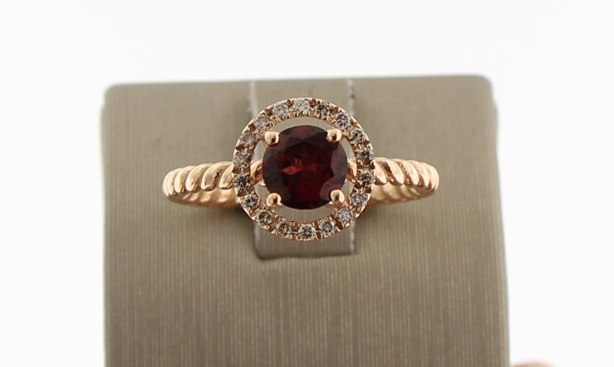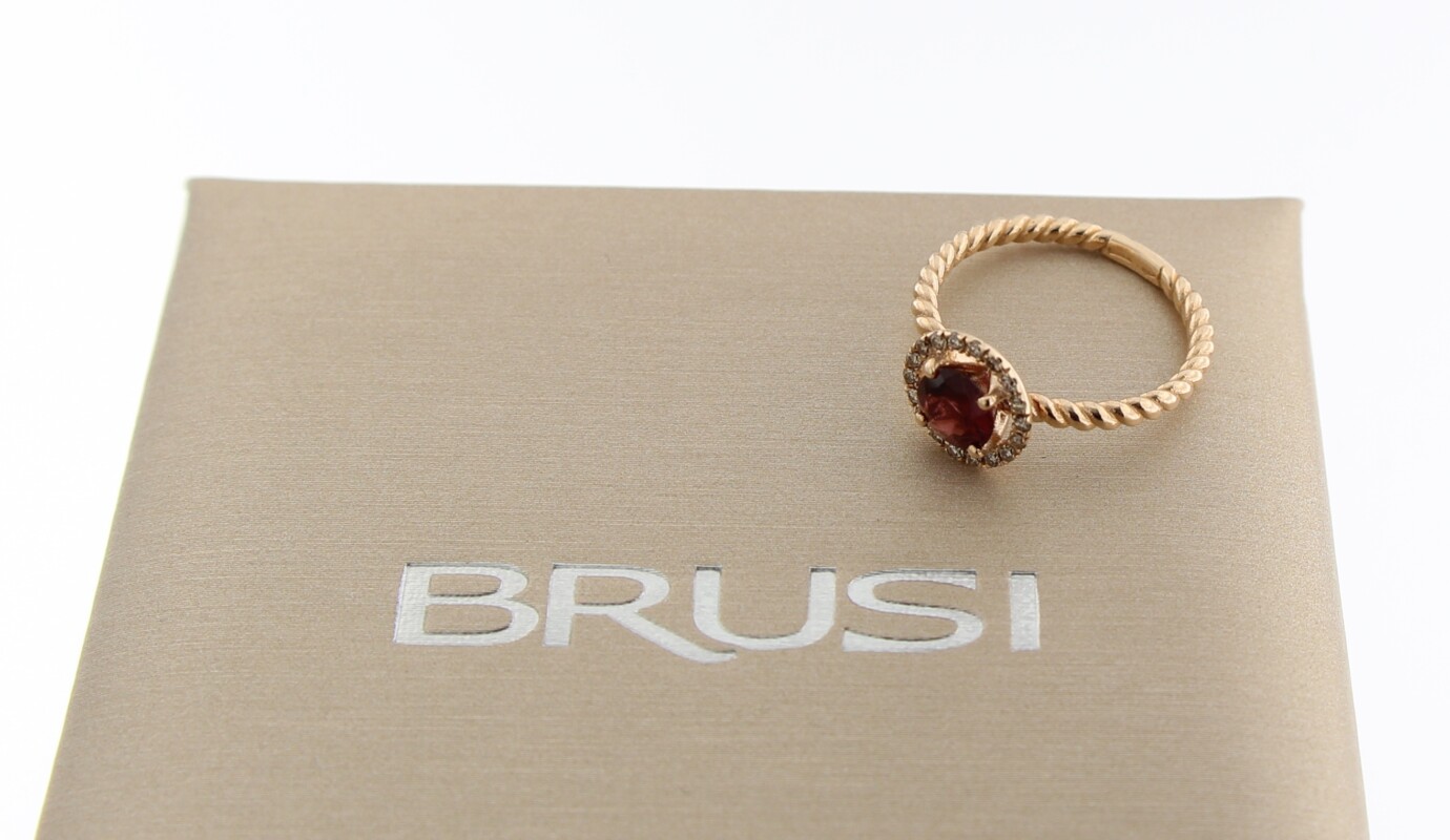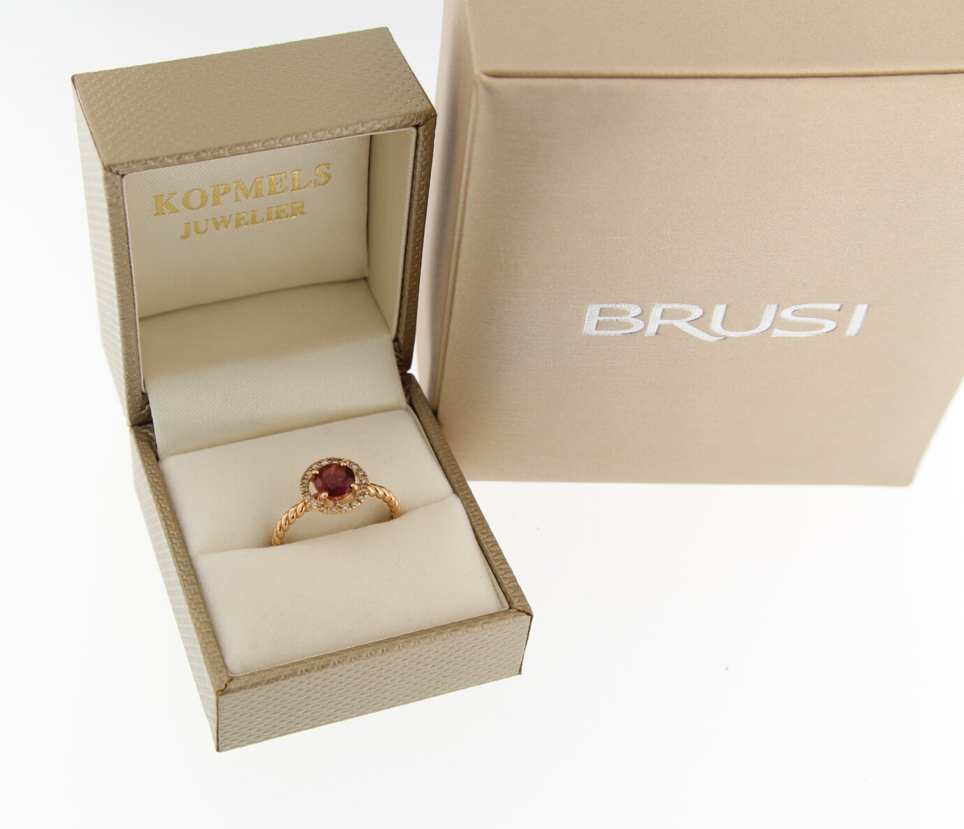 Brusi rosegouden ring, Big Kate collectie, met rhodoliet en champagne diamant