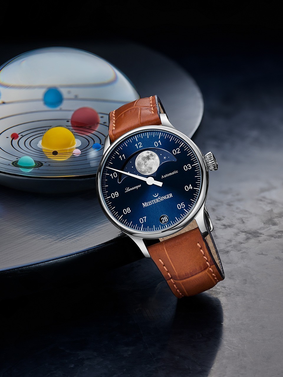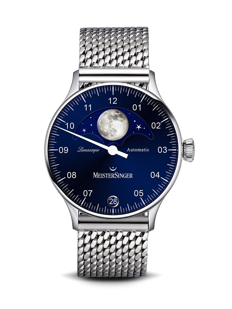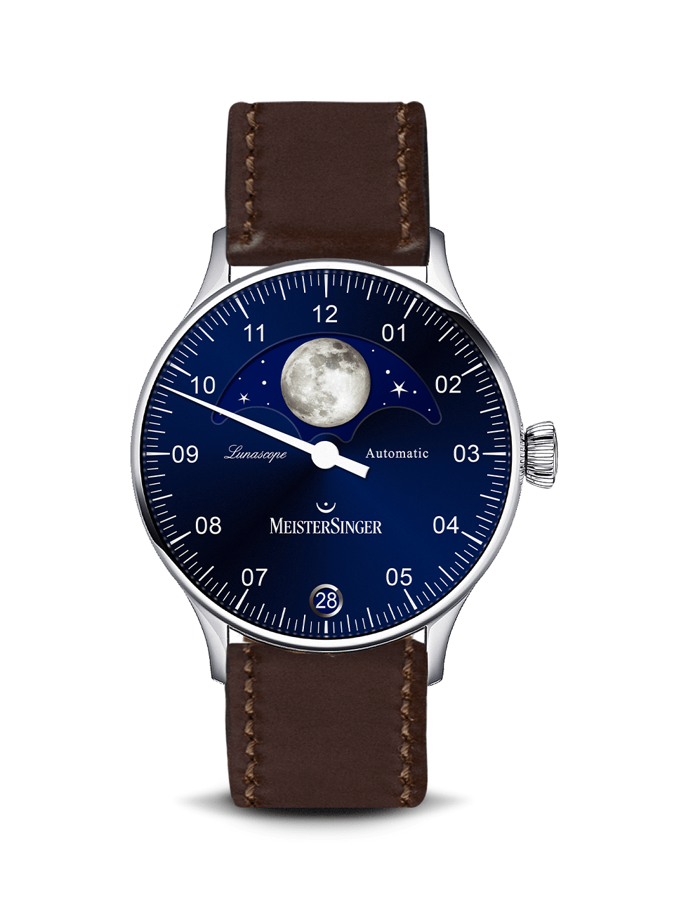 De Meistersinger Lunascope LS908. Met de Lunascope presenteert MeisterSinger zijn eerste astronomische horloge met één wijzer. De slanke roestvrijstalen kast van de Pangaea-familie vormt de ideale achtergrond voor een ongewoon grote maanfaseweergave. De bovenste helft van de wijzerplaat heeft een dynamische snede waarin de maan over een donkerblauwe, sterrenhemel beweegt, net alsof je op een heldere nacht naar de lucht kijkt. De natuurlijke indruk van de satelliet van de aarde komt overeen met de astronomische precisie waarmee de Lunascope de verschillende fasen van de maan weergeeft. De maan heeft 29 dagen, 12 uur, 44 minuten en 2,9 seconden nodig om rond de aarde te reizen.