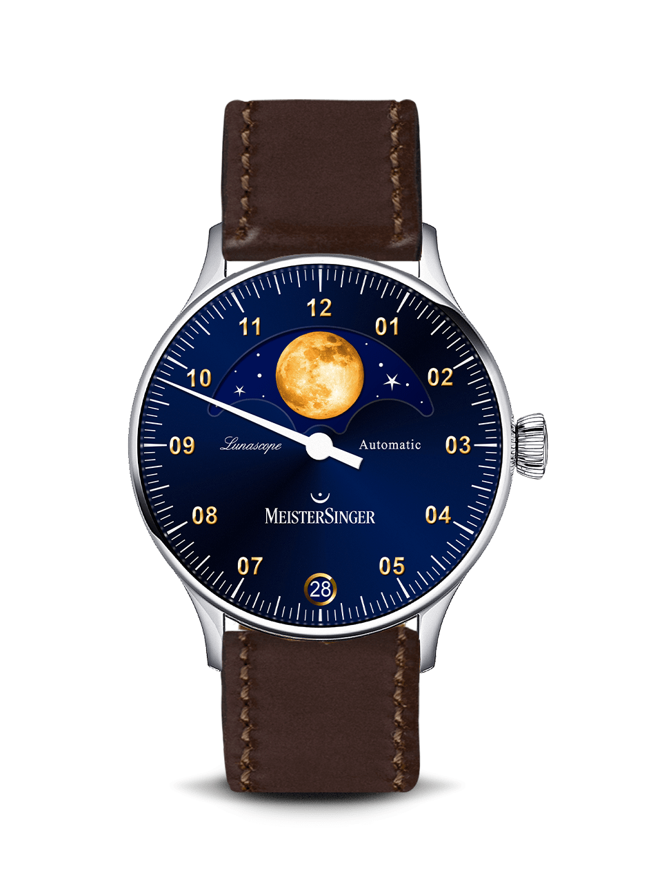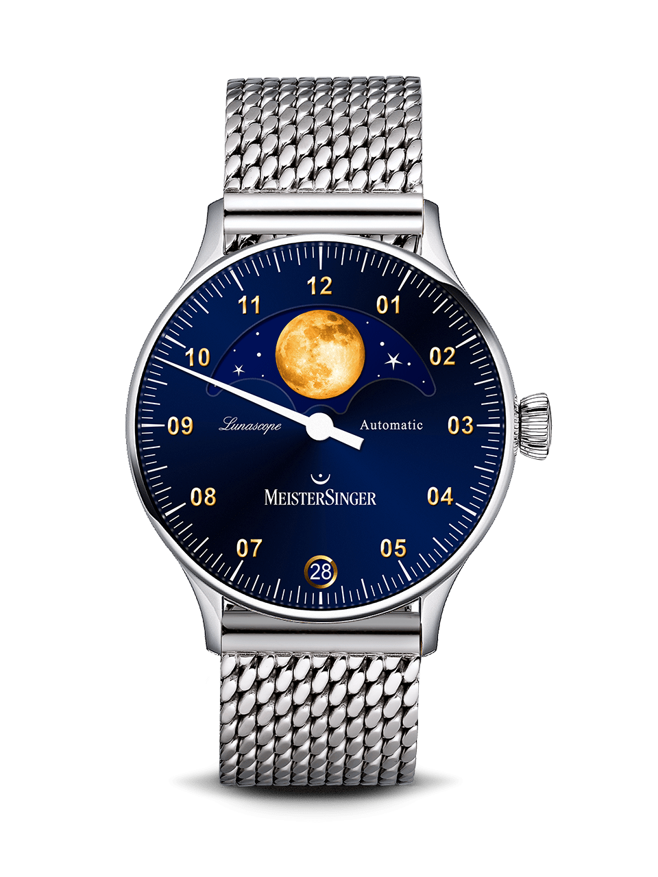 De Meistersinger Lunascope LS908G. Met de Lunascope presenteert MeisterSinger zijn eerste astronomische horloge met één wijzer. De slanke roestvrijstalen kast van de Pangaea-familie vormt de ideale achtergrond voor een ongewoon grote maanfaseweergave. De bovenste helft van de wijzerplaat heeft een dynamische snede waarin de maan over een donkerblauwe, sterrenhemel beweegt, net alsof je op een heldere nacht naar de lucht kijkt. De natuurlijke indruk van de satelliet van de aarde komt overeen met de astronomische precisie waarmee de Lunascope de verschillende fasen van de maan weergeeft. De maan heeft 29 dagen, 12 uur, 44 minuten en 2,9 seconden nodig om rond de aarde te reizen.