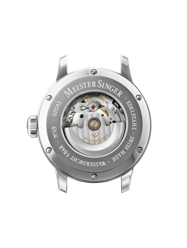 De MeisterSinger N ° 03 AM903 combineert de esthetische principes van het moderne eenwijzerhorloge met een zeer energiezuinige aandrijving in de vorm van een Zwitsers automatisch uurwerk dat zijn kracht haalt uit de activiteit van de drager. Onder de zesvoudig geschroefde glazen achterkant van het horloge, kan de centraal gemonteerde oscillerende rotor worden waargenomen terwijl deze zijn energie overbrengt op de veerton, die tot 38 uur gangreserve kan verzamelen.