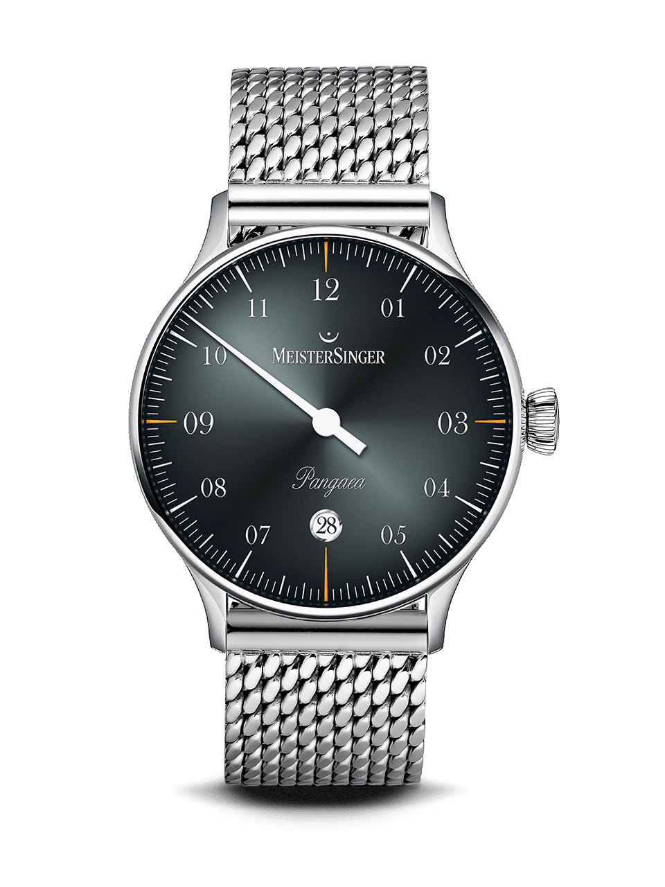 Daarom heeft MeisterSinger een van zijn meest succesvolle modellen, de Pangaea, herzien en uitgerust met een datumweergave die het ontwerpconcept van het horloge weerspiegelt. De MeisterSinger-ontwerptaal is gebaseerd op historische instrumenten met een strikt objectieve uitstraling, maar ook op de gezichten van vroege zakhorloges, vooral die waarvoor niets meer nodig was dan een enkele, slanke hand. Ook de Pangaea, het meest elegante model onder de MeisterSinger-klassiekers, maakt deel uit van deze traditie.