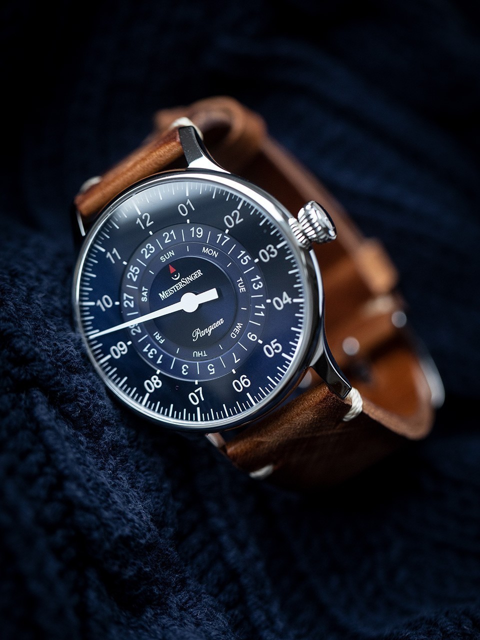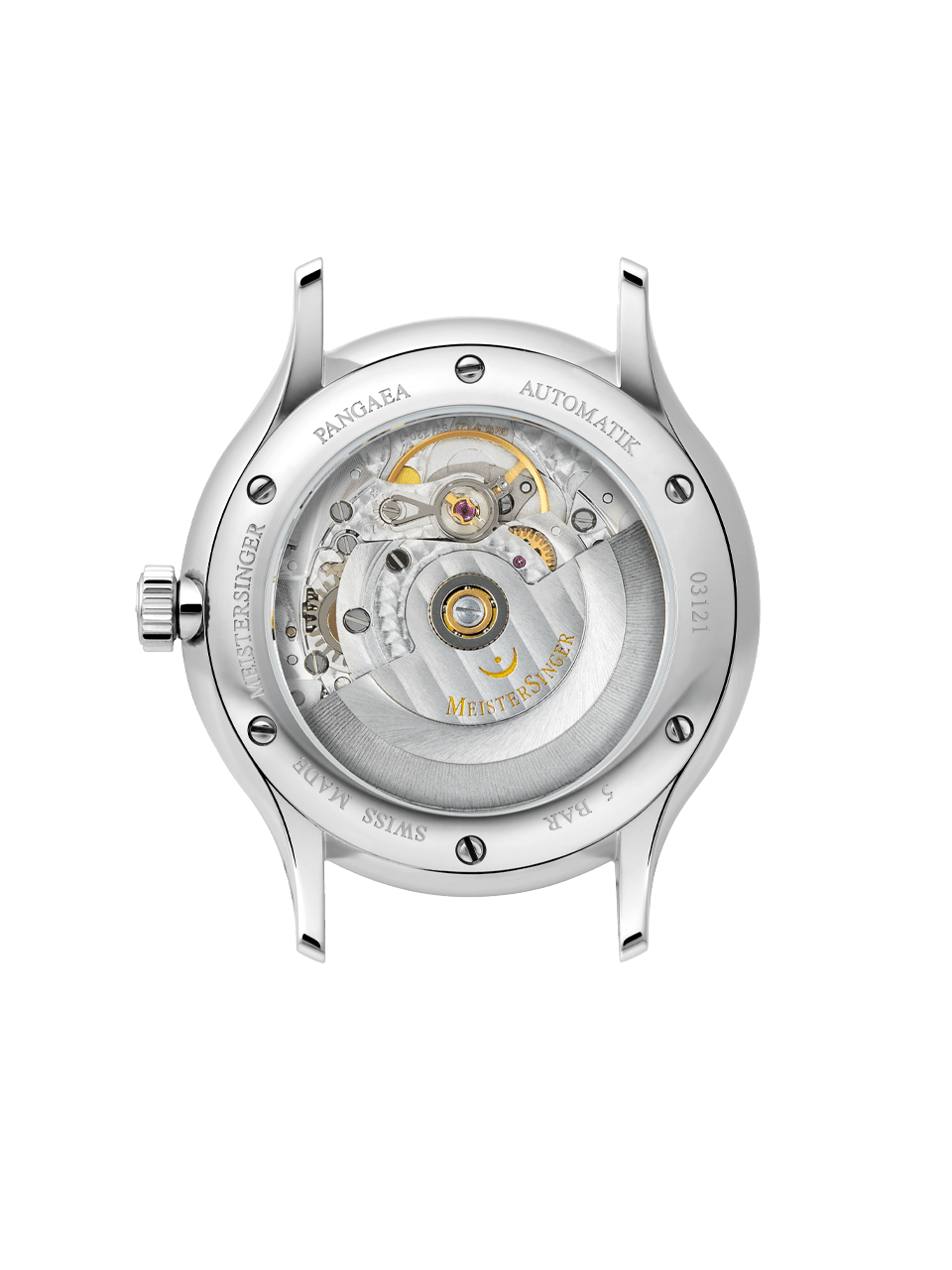De Meistersinger Pangea Day Date PDD908 toont de tijd, de datum en de weekdag in één oogopslag – ook al heeft deze maar één uurwijzer. De datum- en weekdagringen draaien open en zijn zorgvuldig uitgebalanceerd in het midden van de wijzerplaat. Elke dag om middernacht gaan ze een stap verder en groeperen ze zich om de huidige datum onder de 12 te vormen. De Pangea Day Date heeft verschillende felbegeerde prijzen gewonnen voor deze ongebruikelijke manier om de tijd aan te geven en voor de zorgvuldig gecoördineerde typografie.