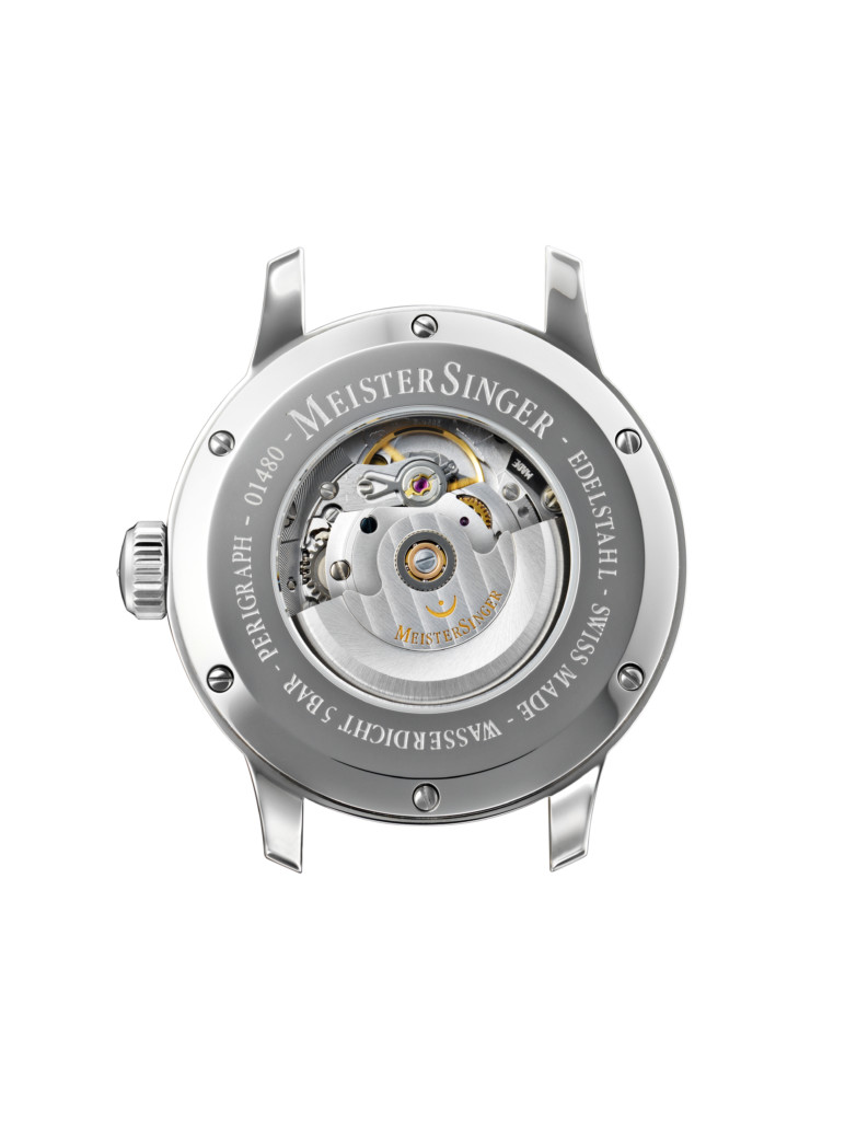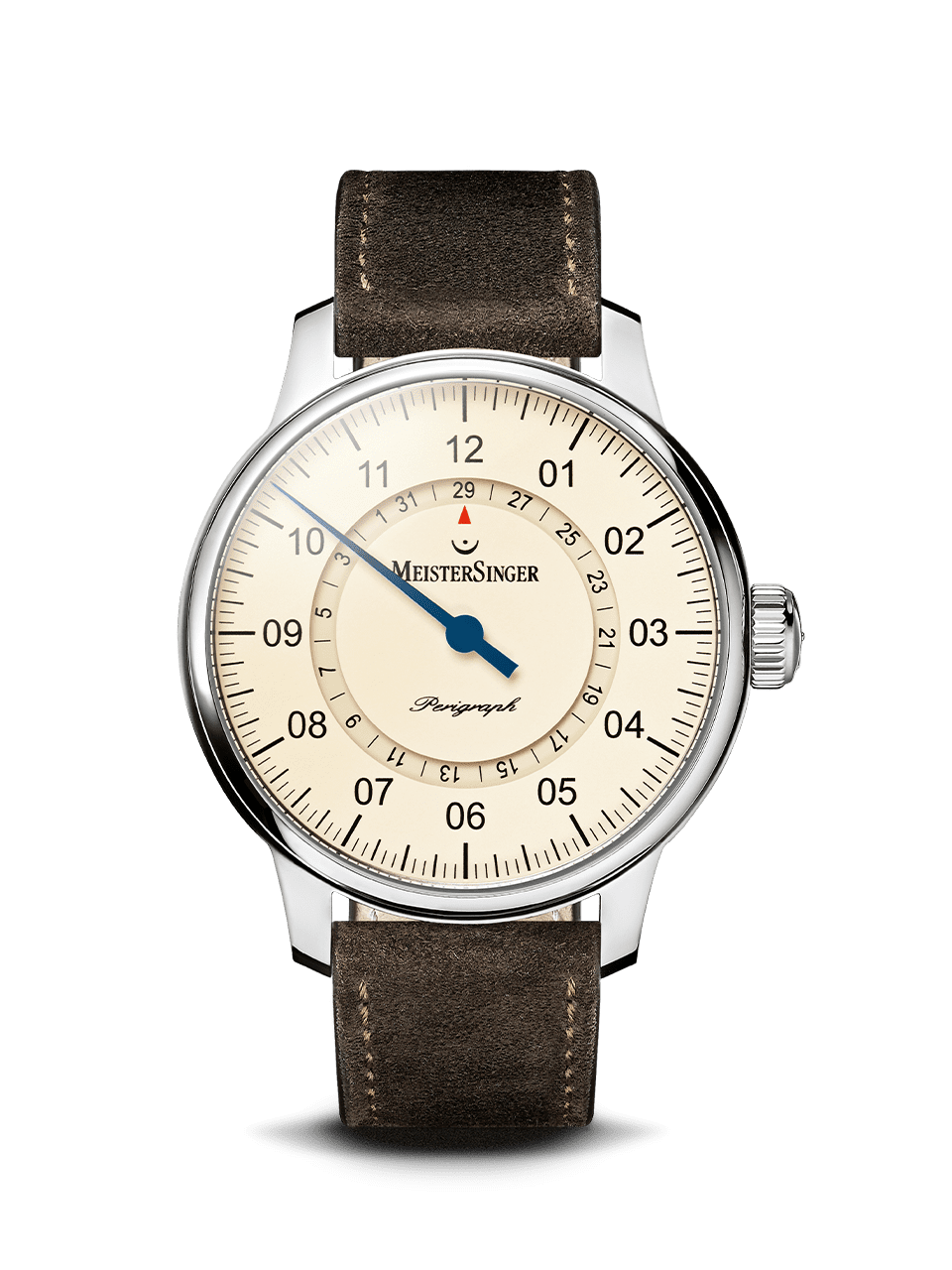 De Meistersinger Perigraph AM1003. MeisterSinger heeft vaak een flair voor het ongewone bij het ontwerpen van horloges met één wijzer en de Perigraph, die ook een datumweergave heeft, is daarop geen uitzondering. De mooi uitgebalanceerde datumring draait vrij rond het midden van de wijzerplaat. Een kleine pijl om 12 uur wijst naar de huidige datum, die elke dag om middernacht een stap vooruit gaat. Deze analoge weergave van de datum komt overeen met de ronde tijdweergave en biedt net zo goed een overzicht.