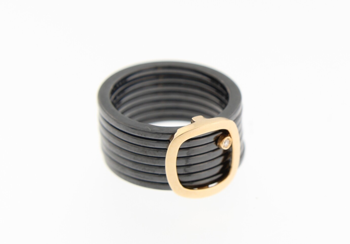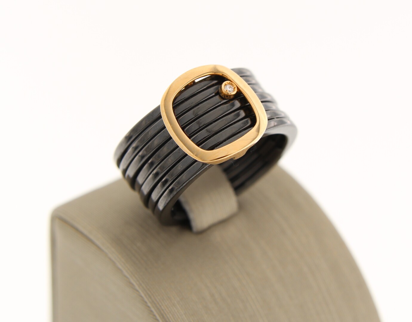 Ring zwart keramiek, rose goud en diamant, mt 18